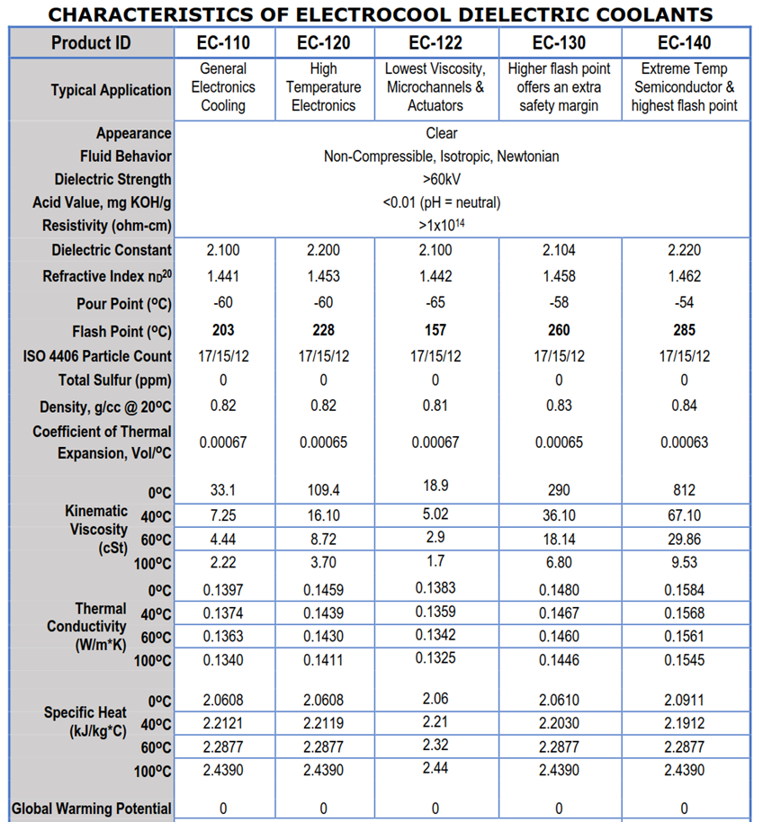 Made for Electronics Cooling, ElectroCool Dielectric Coolants feature the broadest material compatibility profile in the industry, the highest dielectric strength, zero environmental impact, and the foremost health and safety for users.